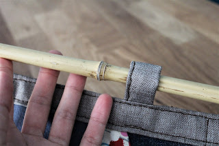 As I said above, the panel was made with small pieces of fabric (I challenge you to identify pieces of fabric you might have given me!) and the "frame" was made with parts of a curtain to which I made the hem. On the back, I used part of an old pillow case. And I already had at home the piece of cane. It was a leftover from some gardening I did and it was hanging at the house without any destination.